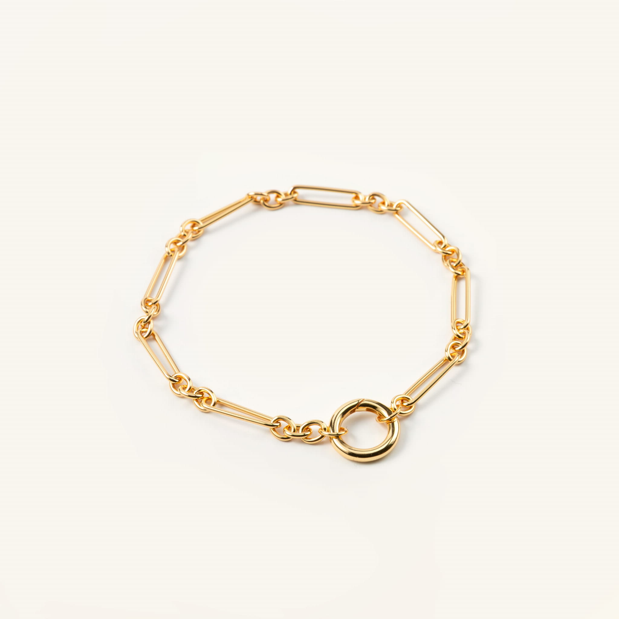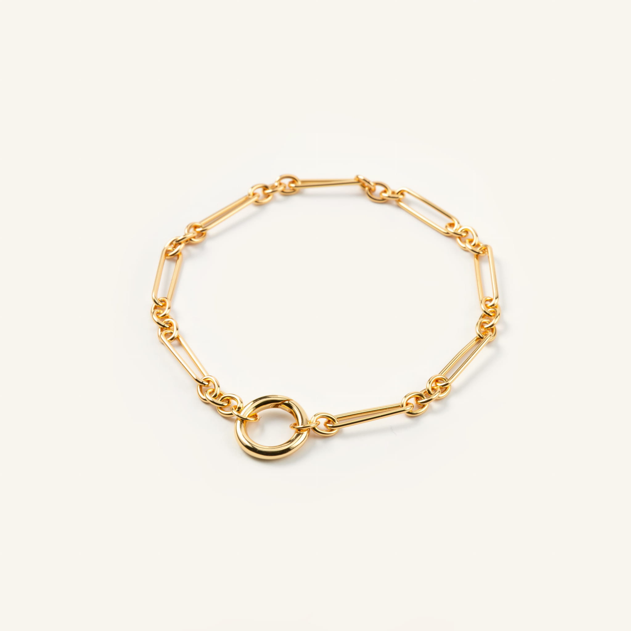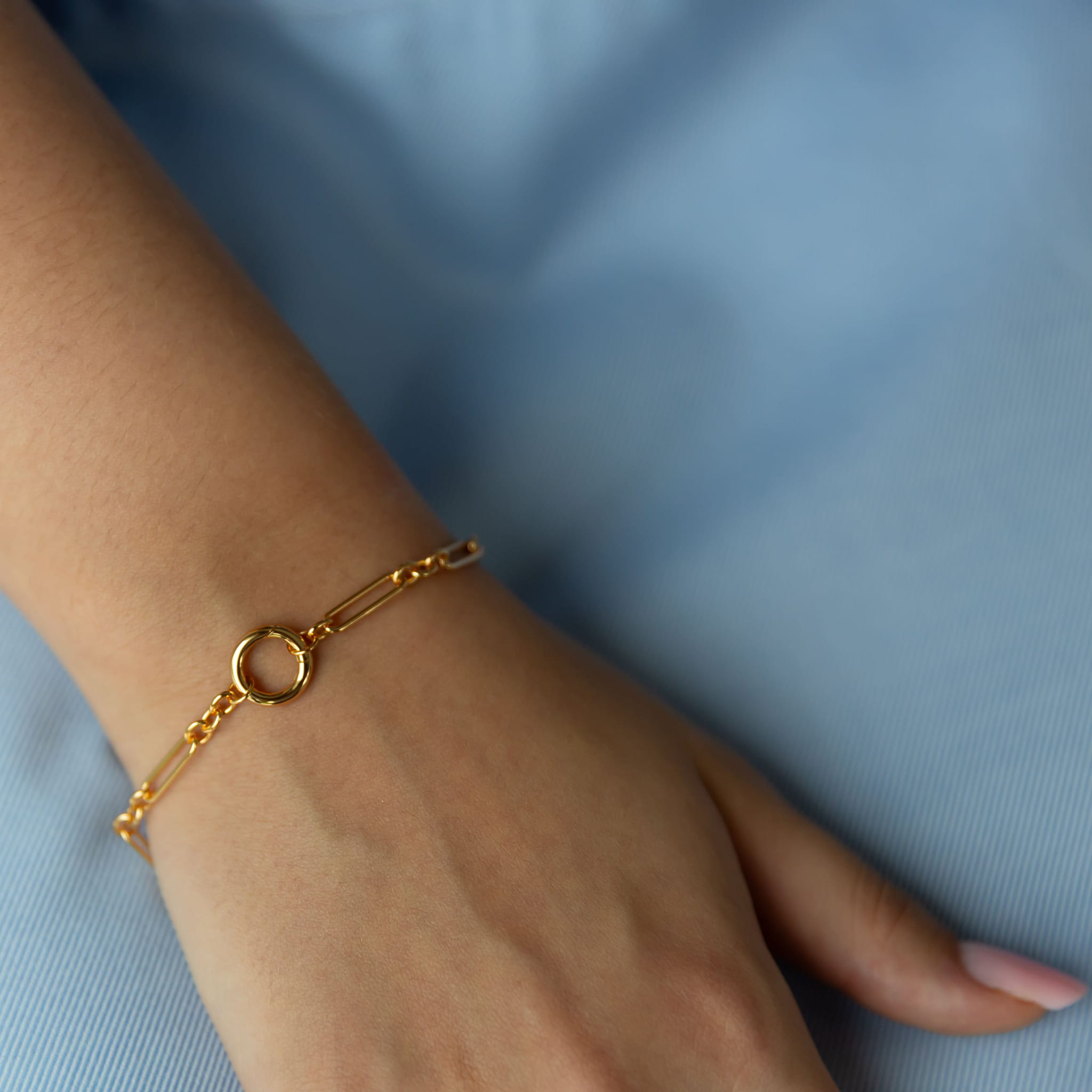Ta bransoletka to esencja prostoty, która daje nieskończone możliwości. Złoty łańcuszek o wydłużonych, geometrycznych ogniwach wygląda lekko i nowocześnie a jednocześnie przyciąga uwagę swoją subtelną elegancją. Zakończona gładkim kółkiem, które zaprasza do zabawy formą i dodatkami. Możesz spersonalizować swoją biżuterię, dobrać do bransoletki zawieszkę z naszej kolekcji. Perłę, kamień naturalny, zawieszkę jedną lub kilka i za każdym razem stworzyć zupełnie inny look. Delikatnie, klasycznie lub odważnie.