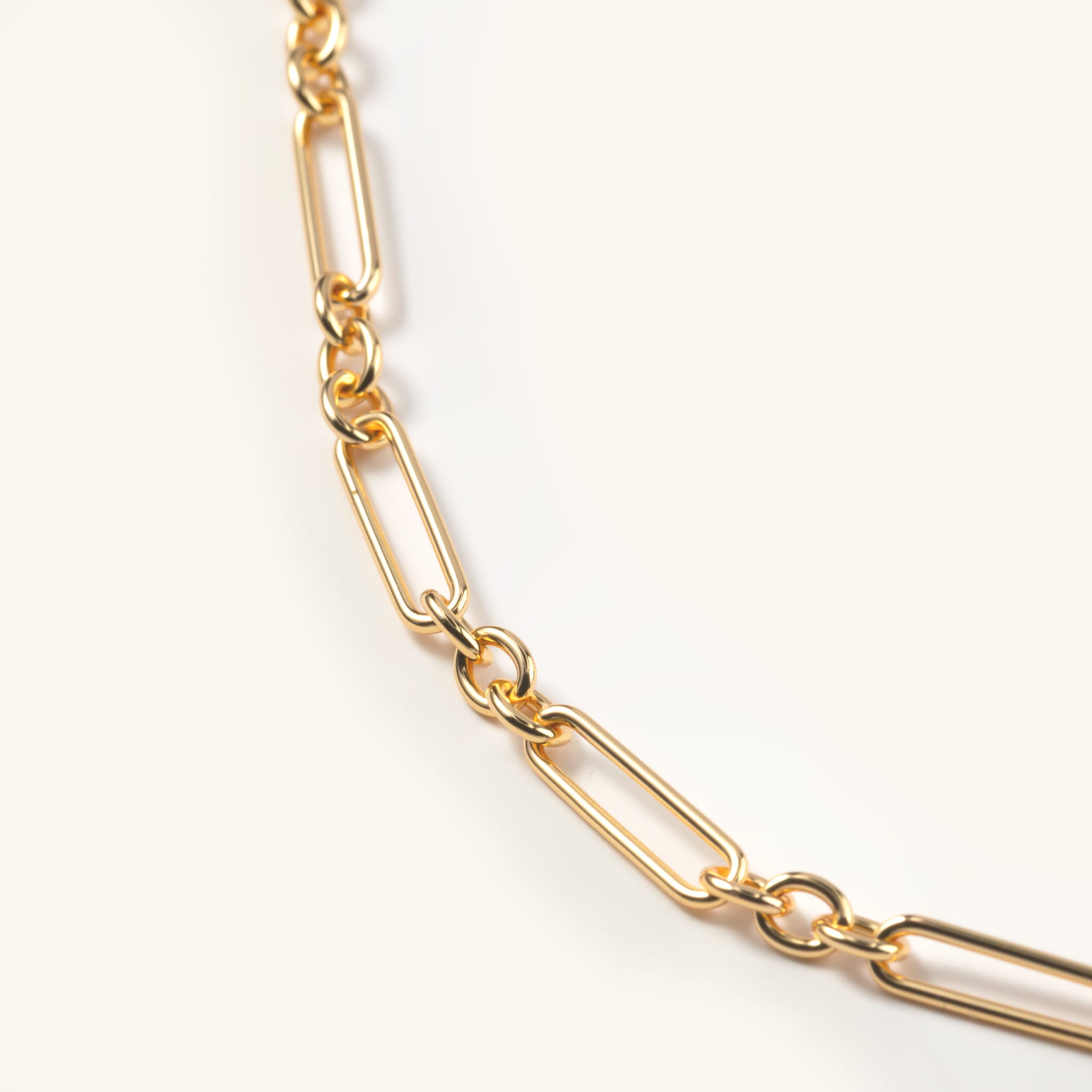 Naszyjnik o złotych wydłużonych ogniwach i lekkiej, geometrycznej formie tworzy nowoczesną całość, którą można nosić solo lub z dodatkami.