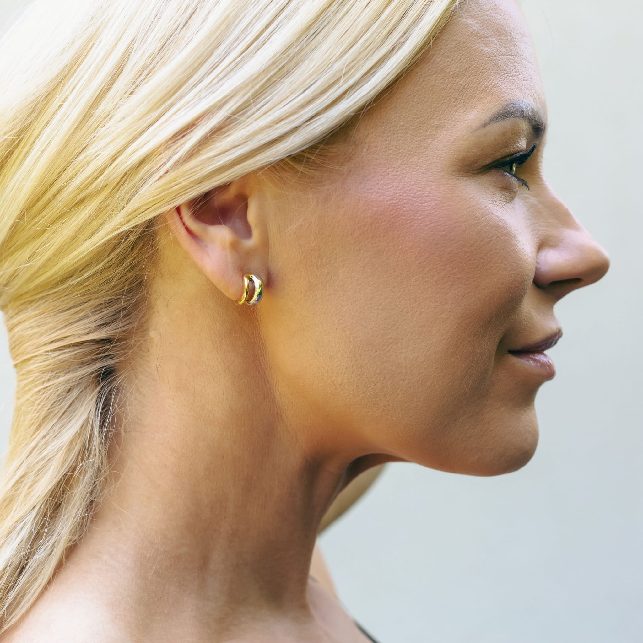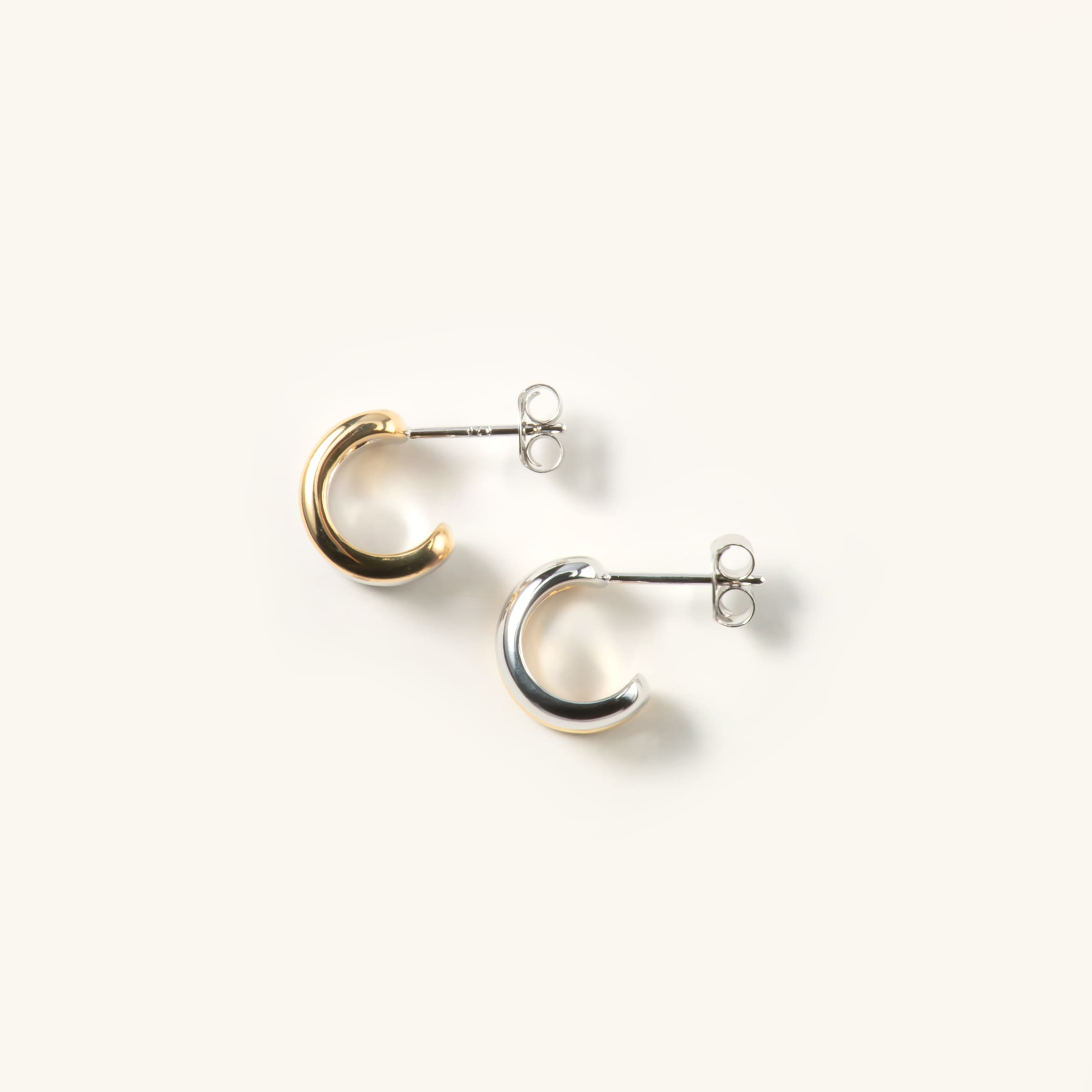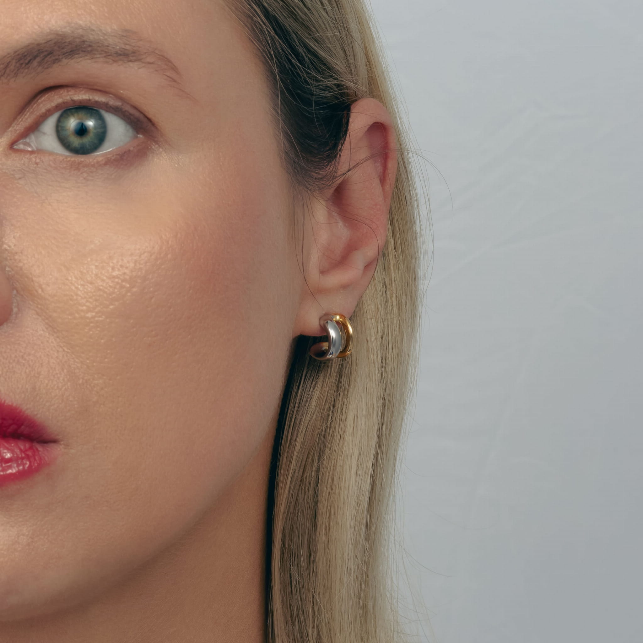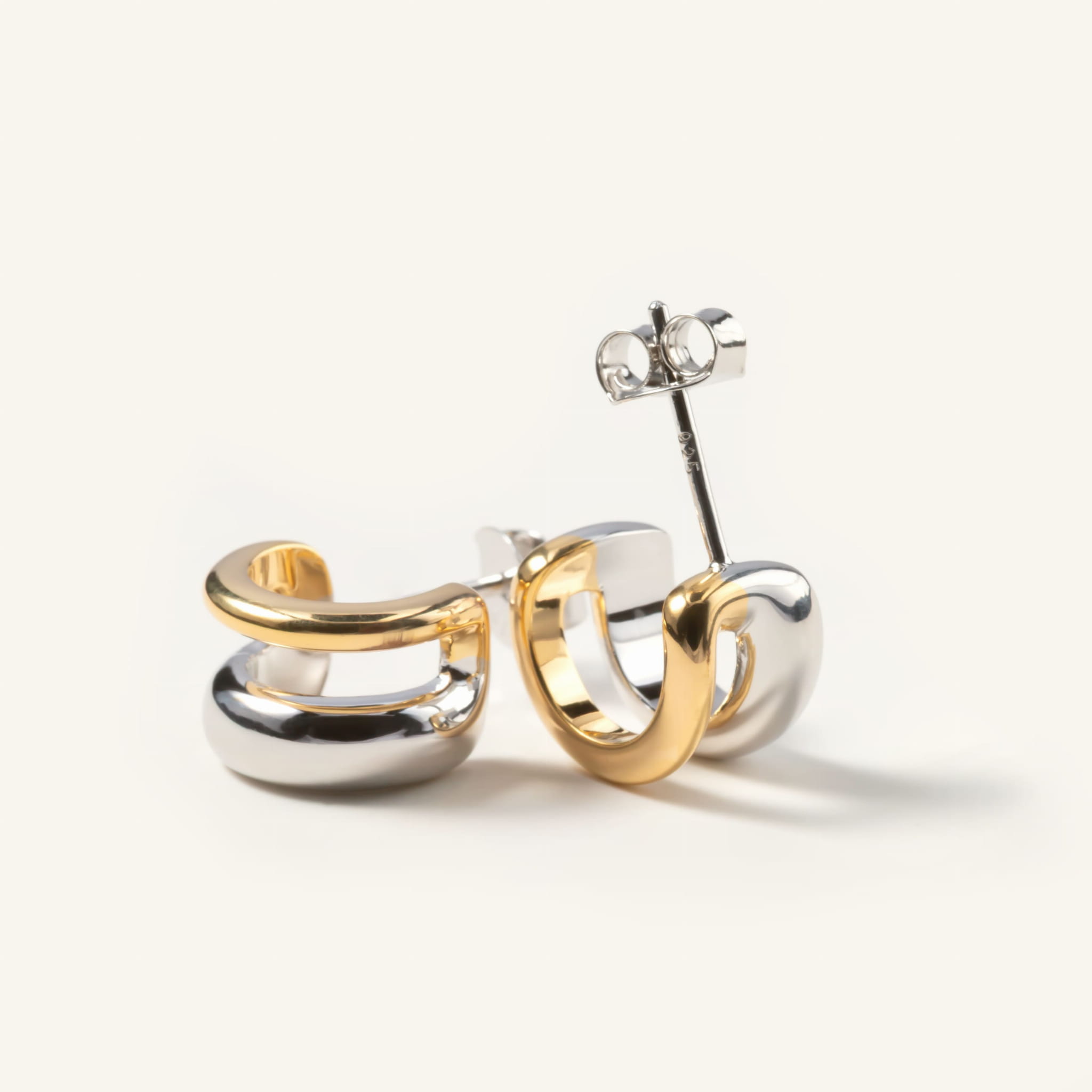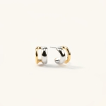 Kolczyki łączące złoto i srebro zamknięte w nowoczesnej i nietuzinkowej formie. Kontrastujące kolory i minimalistyczny design pozwala miksować je z dowolnymi dodatkami. Świetne prezentują się również w kolejnych dziurkach w uchu, tworząc piękną kompozycję z innymi kolczykami lub błyszcząc solo. Są świetnym pomysłem na prezent z uwagi na swój minimalistyczny i uniwersalny styl.