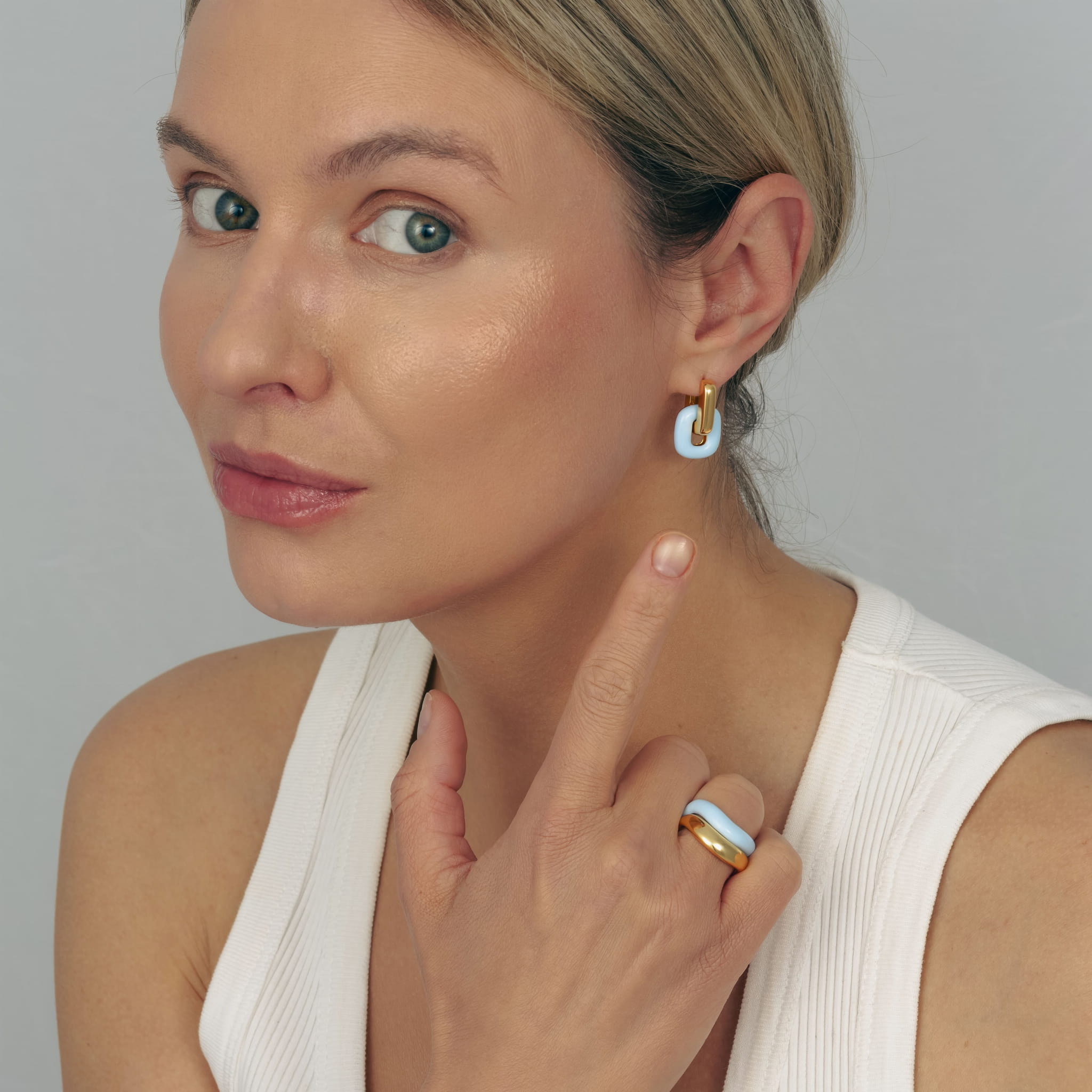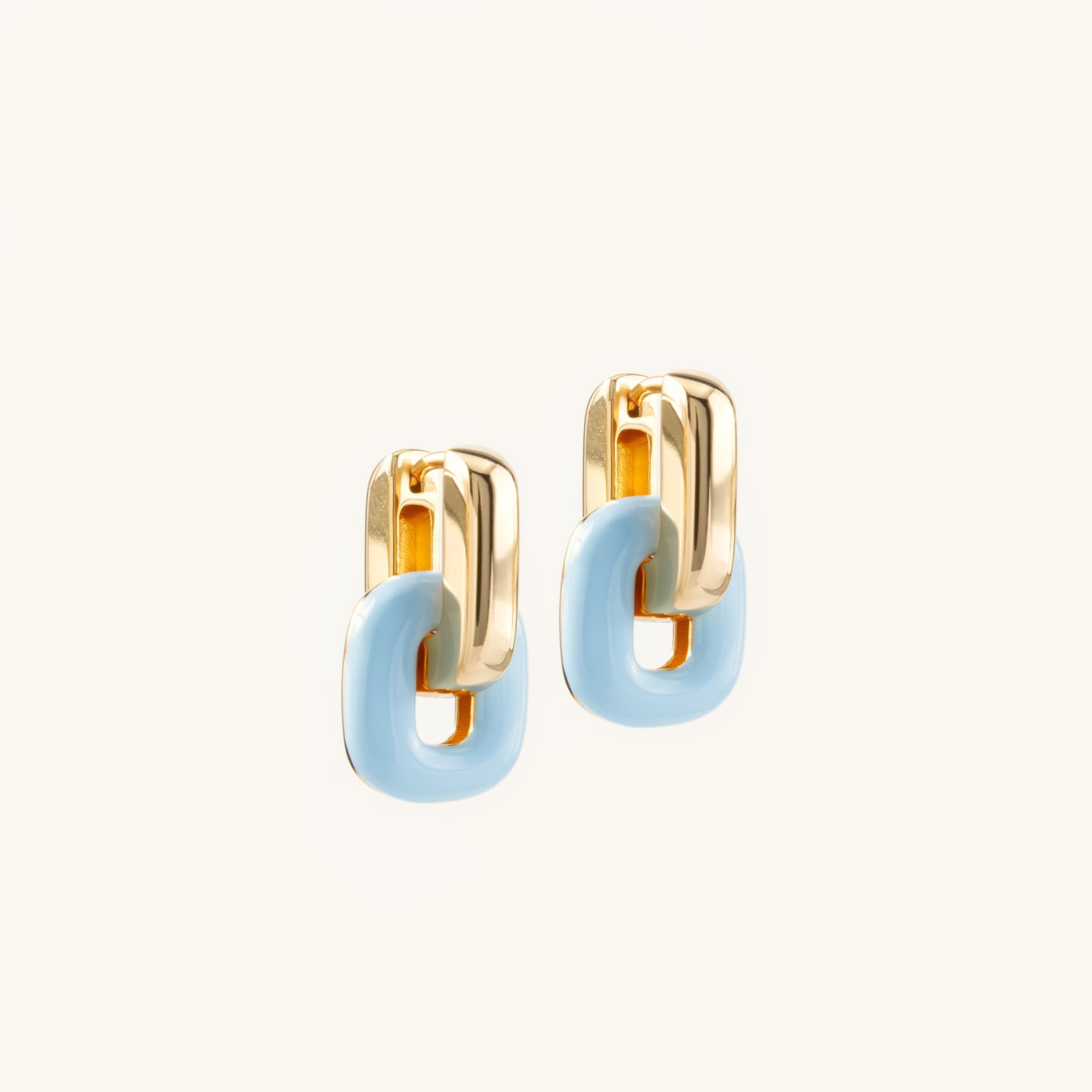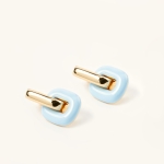 Złote kolczyki o geometrycznej formie i nowoczesnym designie inspirowanym kształtem ogniwa - symbolem siły, połączenia i niezależności. Są wyraziste, ale nie krzykliwe. Eleganckie w nowoczesnym designerskim stylu. Niebieski kolor dodaje im wakacyjnego charakteru.