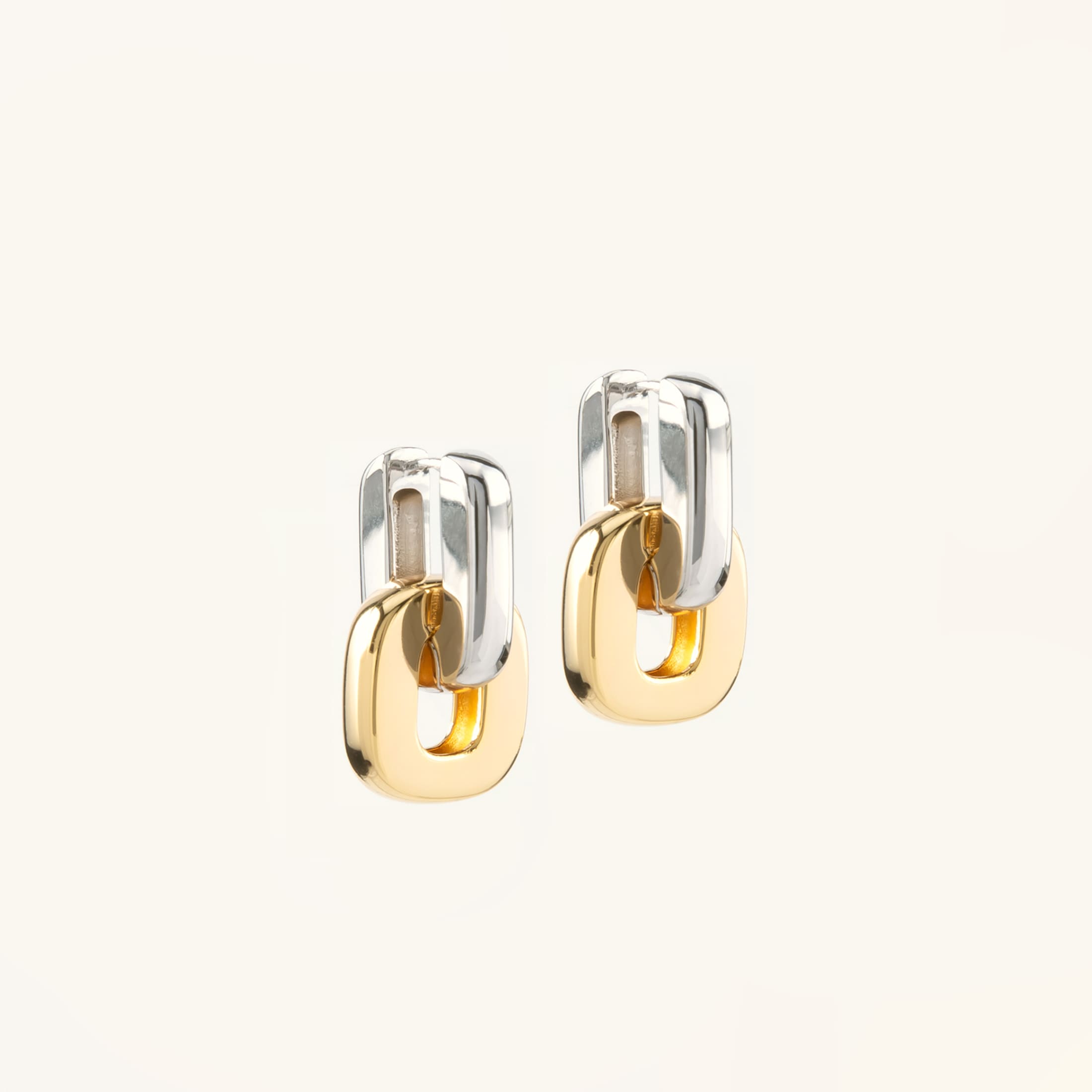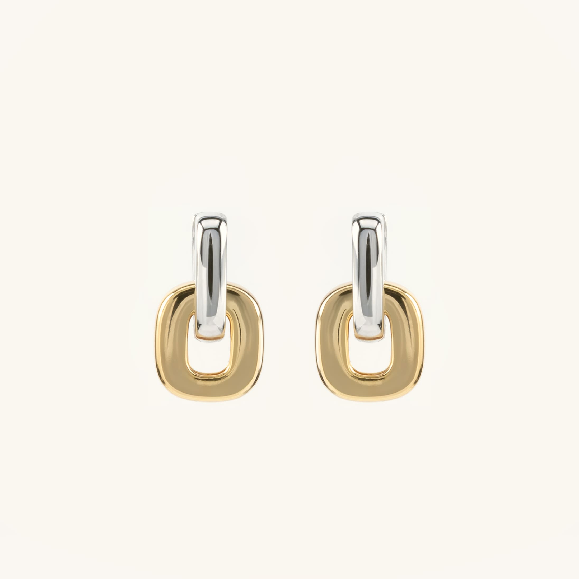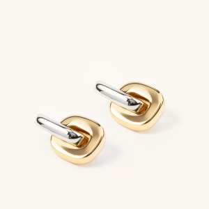 Srebrno-złote kolczyki o geometrycznej formie i nowoczesnym designie inspirowanym kształtem ogniwa – symbolem siły, połączenia i niezależności. Są wyraziste, ale nie krzykliwe. Lekkie, eleganckie w nowoczesnym designerskim stylu.