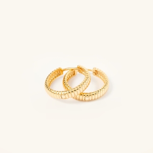 Kolczyki typu koła z charakterystyczną, karbowaną strukturą to biżuteria, która natychmiast przyciąga wzrok – nie przez błysk, a przez formę. Smukłe, perfekcyjnie zaokrąglone, z lekkim retro twistem. Pasują do każdej stylizacji, świetnie prezentują się także w kolejnych dziurkach w uchu, tworząc efektowną kompozycję z innymi kolczykami. Idealne na prezent. Dostępne w dwóch rozmiarach – tak, byś mogła wybrać wersję idealnie dopasowaną do siebie lub połączyć obie.