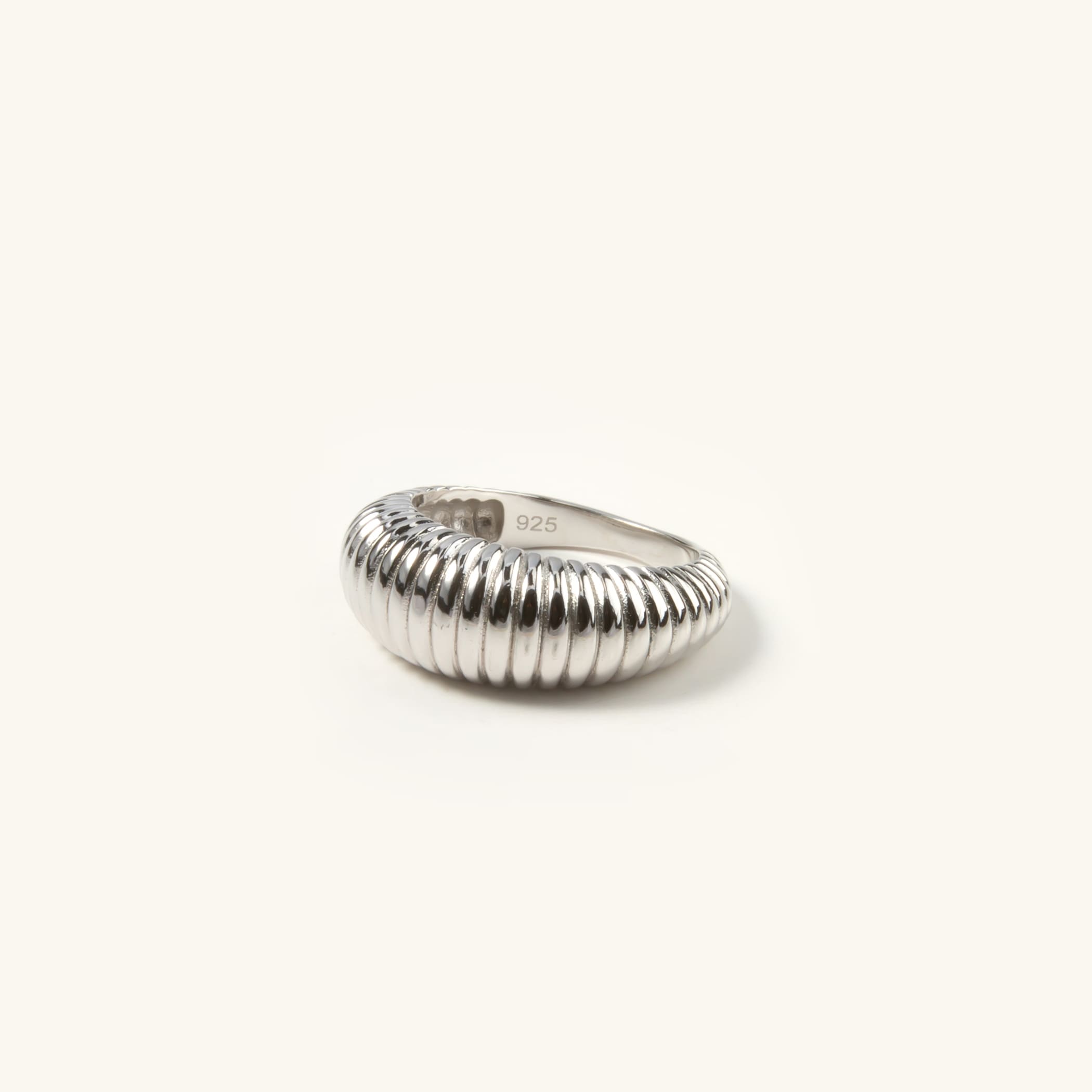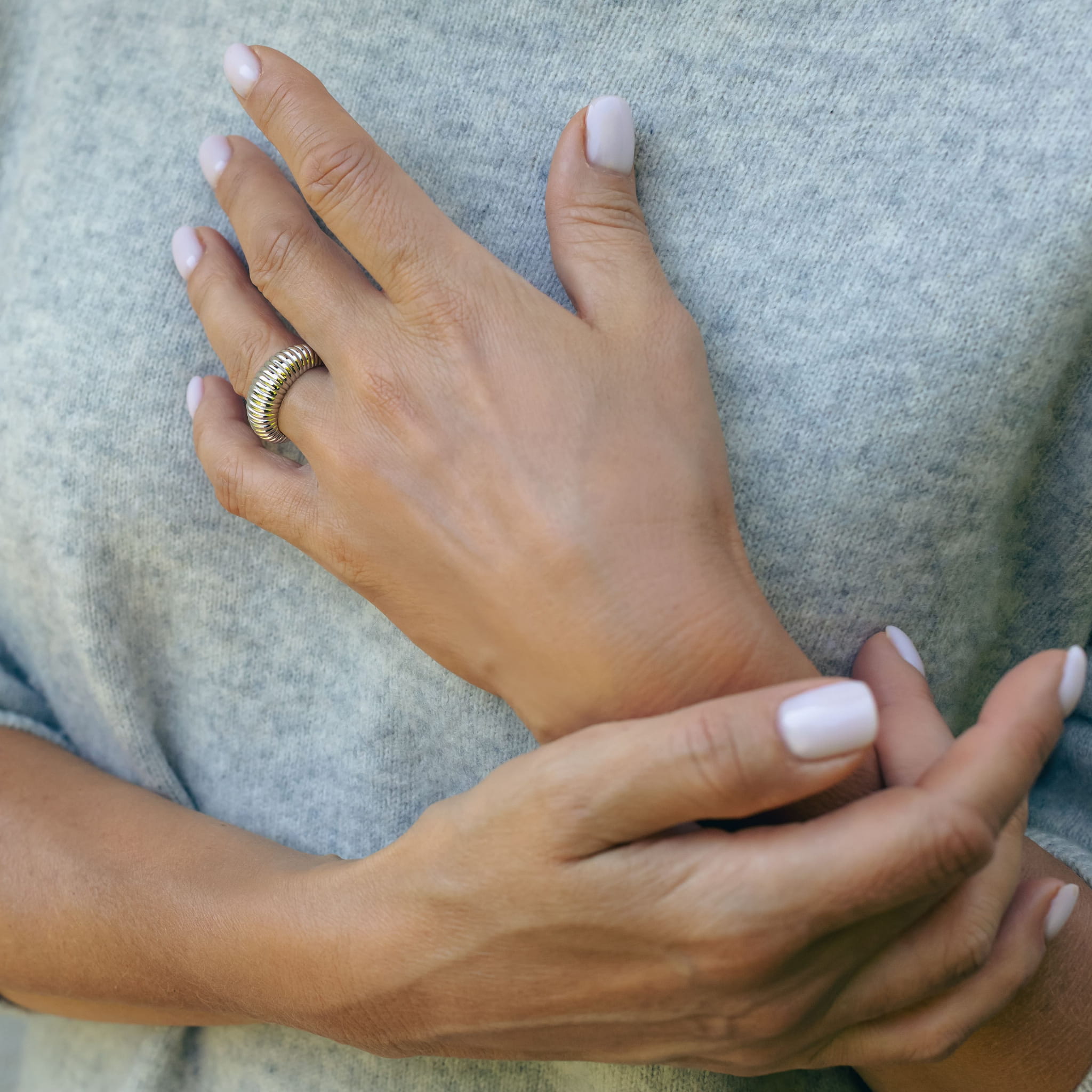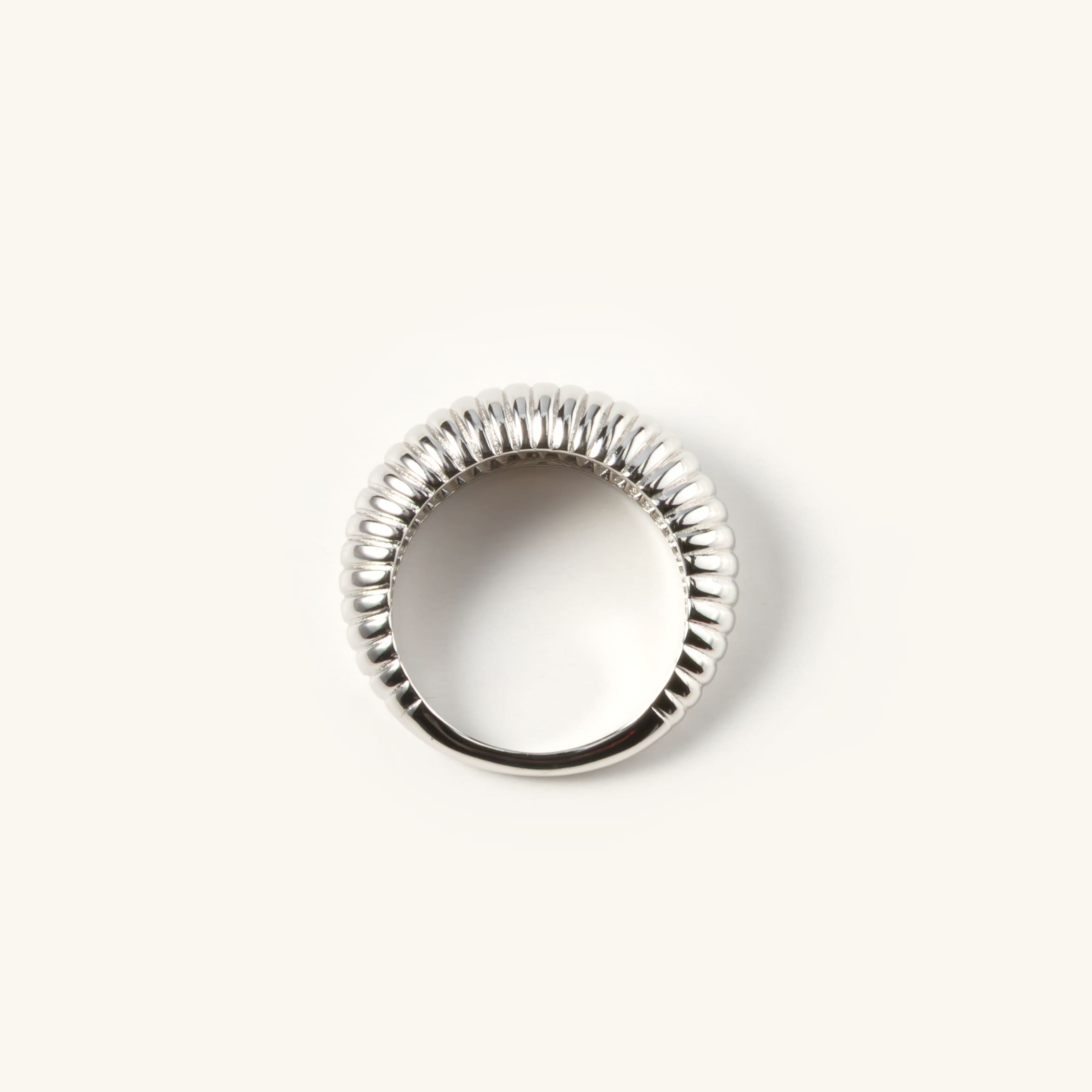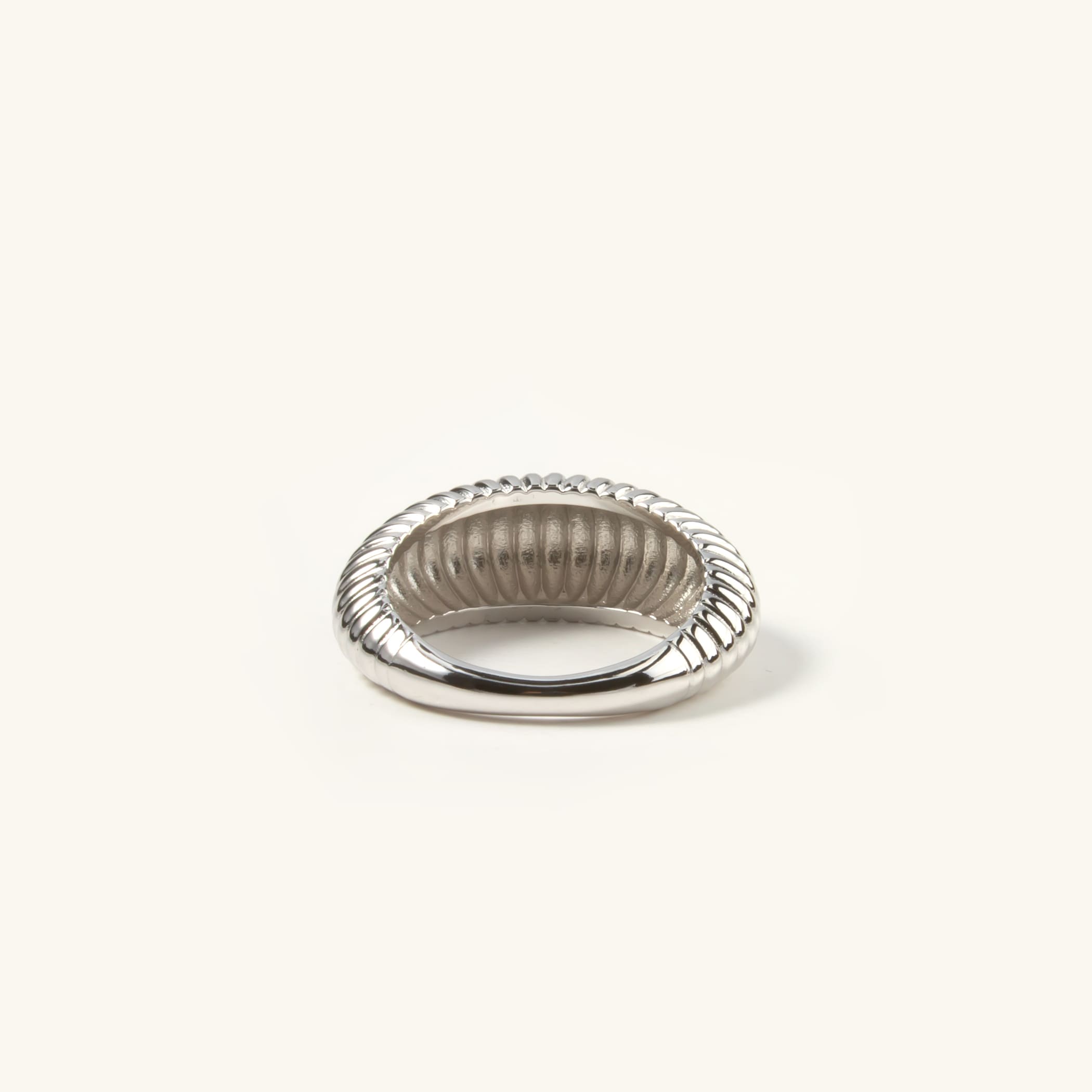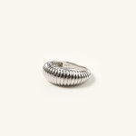 Pierścionek o ciekawej ryflowanej fakturze, która dzięki zaokrągleniu daje wyjątkowy efekt, wyrazisty i subtelny jednocześnie. Dzięki swojej nietuzinkowej strukturze pięknie odbija światło. Biżuteria świetnie podbija look casualowej stylizacji, może być również mocnym akcentem do wieczorowej sukienki. Pierścionek ma swoją parę w postaci kolczyków RIB. Razem tworzą mocny duet, który podkreśli Twój styl i osobowość bez zbędnych słów. Dostępny w rozmiarach 14, 16, 18.