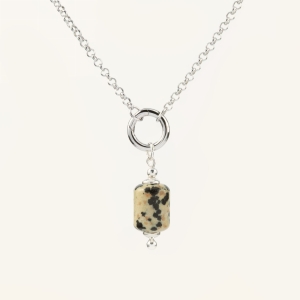 Zestaw CIRCLE&STONE NO.5 to połączenie srebrnego naszyjnika i zawieszki z kamienia jaspis dalmatyński w odcieniach ziemi. Każdy kamień ma unikalne zabarwienie, co sprawia, że każdy zestaw jest niepowtarzalny. To propozycja dla kobiet ceniących naturalność, spokój i biżuterię, która podkreśla indywidualność.