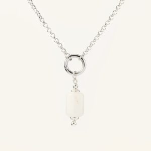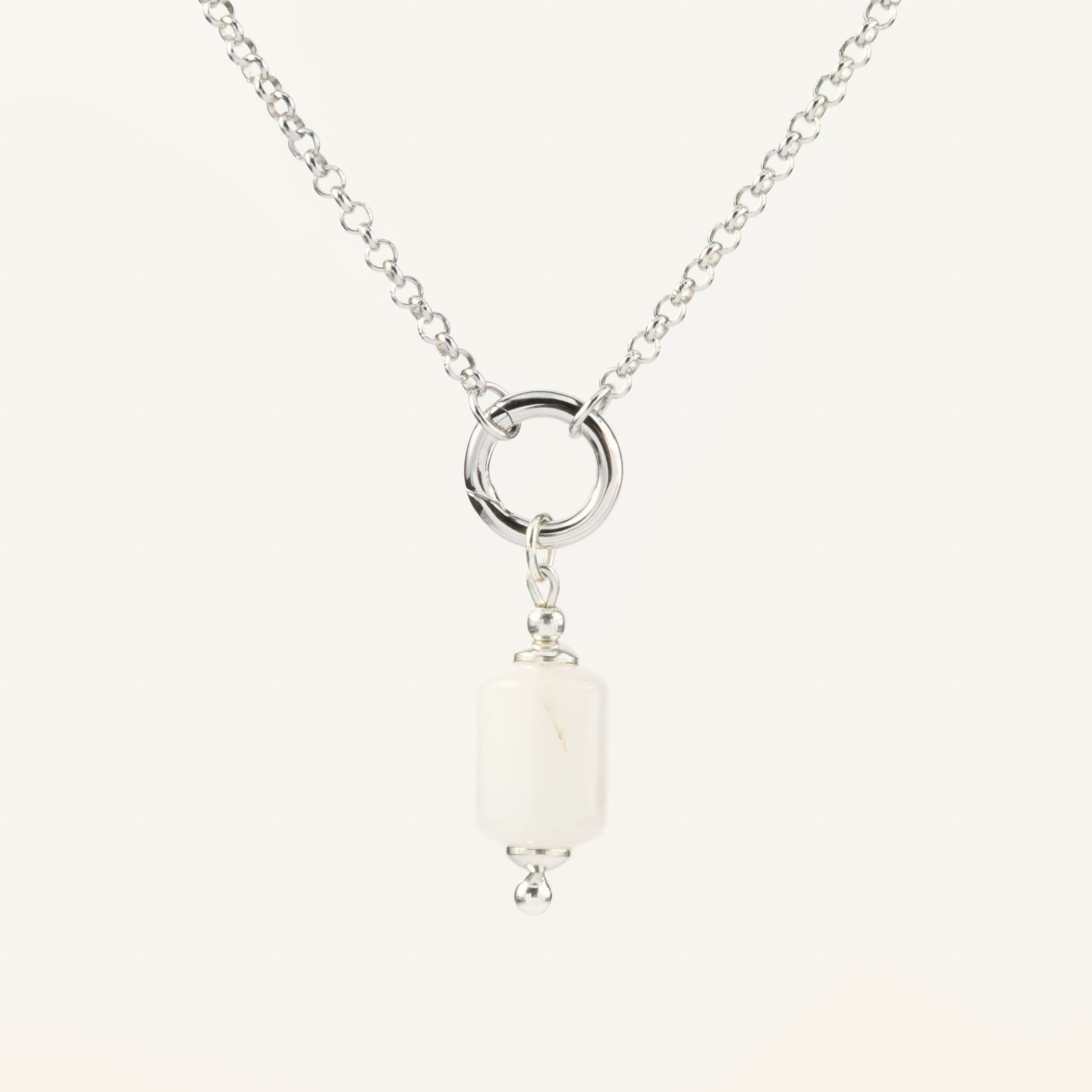Zestaw CIRCLE&STONE NO.6 łączy minimalistyczny, srebrny naszyjnik z zawieszką z białego jadeitu. Kamień ma regularny kształt, ale każde zabarwienie jest unikalne - od mlecznej bieli po lekko perłowe tony. To biżuteria, która rozświetla stylizację i pasuje zarówno do klasyki, jak i nowoczesnych zestawień.