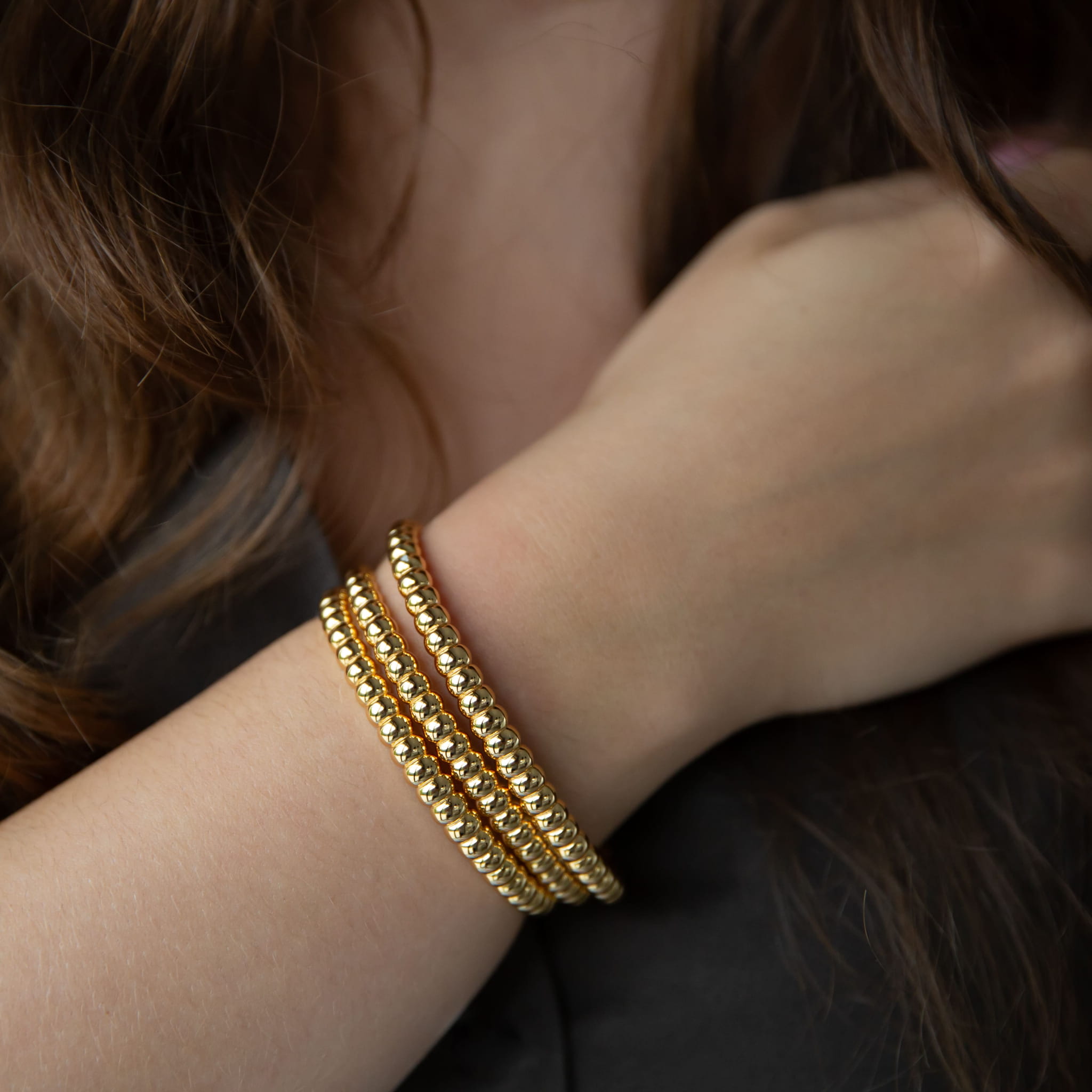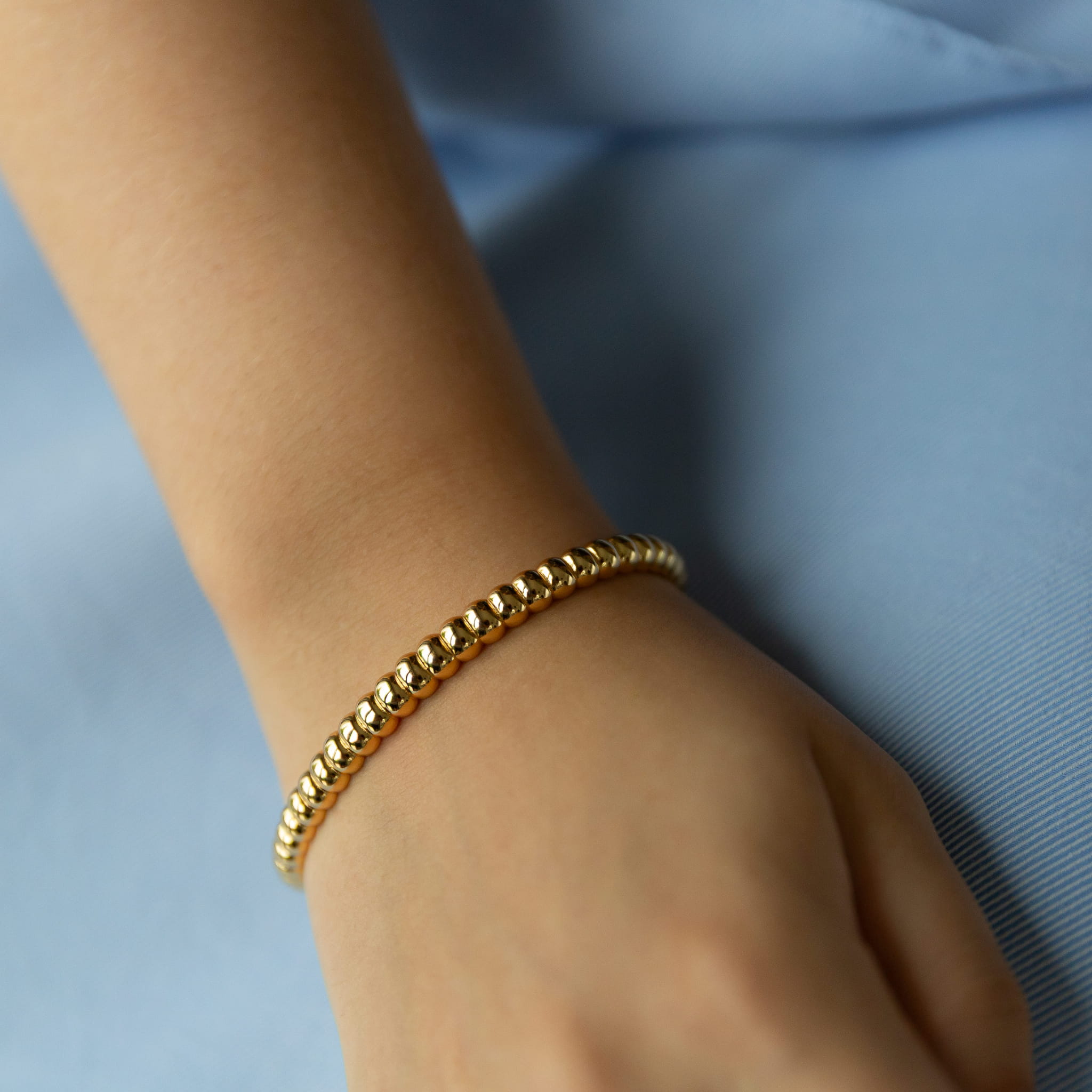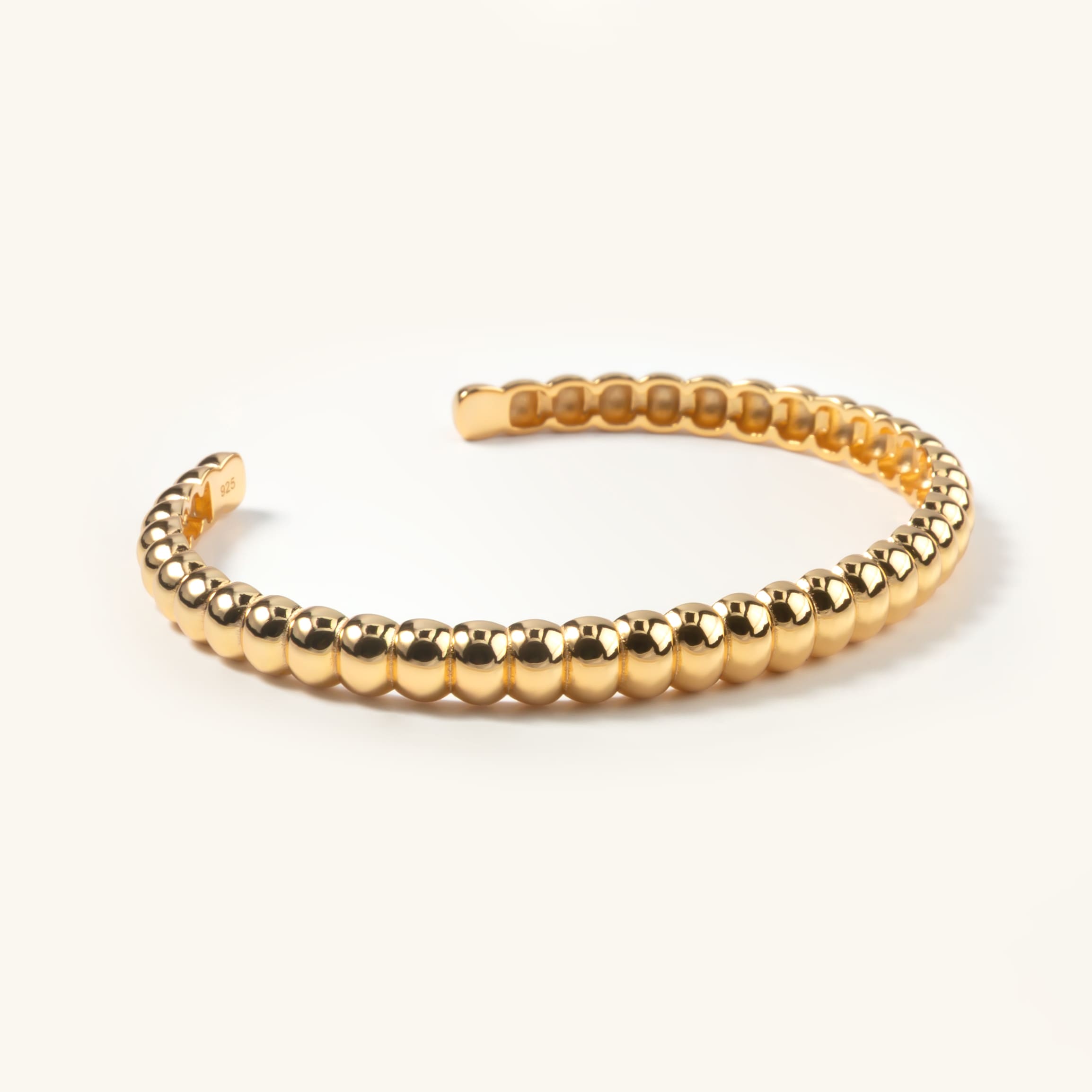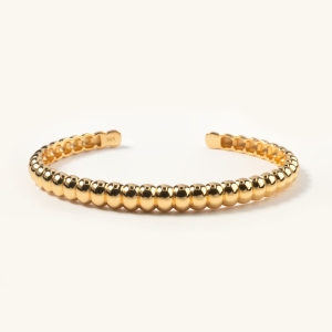 Sztywna bransoletka o kształcie otwartej obręczy, która dopasuje się do dłoni dzięki wyjątkowej elastyczności. Forma bransoletki przypomina rząd idealnie wypolerowanych złotych ziarenek, które pięknie odbijają światło. Łączy w sobie elegancję z nowoczesnym designem.