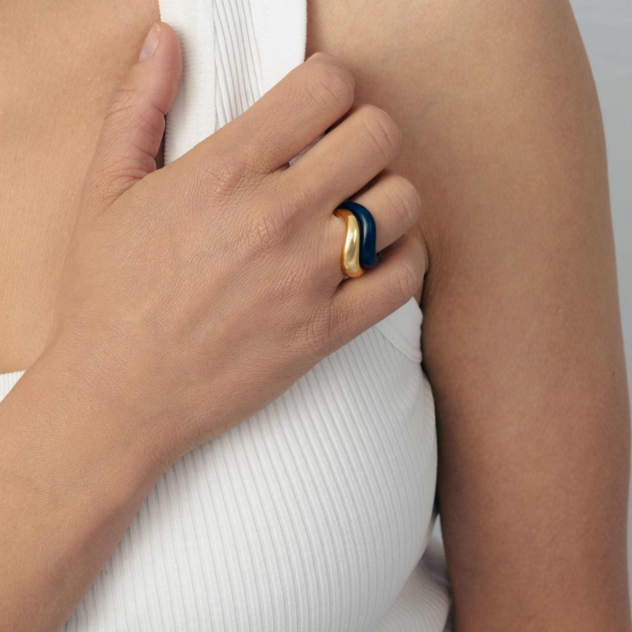 Pierścionek WAVE to czysta forma i nowoczesny intrygujący design. Idealny, jeśli szukasz czegoś, co przełamuje schematy i dodaje świeżości. To pierścionek inspirowany morzem, który możesz założyć do każdej stylizacji zarówno codziennej jak i wieczorowej kreacji. Pokryty emalią w kolorze granatowym, dostępny w rozmiarach 14, 16 i 18.